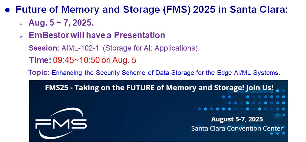 In addition to participation on the activities at FMS, Dr. Chanson Lin, President of EmBestor, will give a presentation at Session AIML-102-1 (Storage for AI: Application) on Aug 5. The presentation topic is, “Enhancing the Security Scheme of Data Storage for the Edge AI/ML Systems” to talk about system-wide security, AI/ML model protection, HSM methodologies, and infrastructure security with the Smart Security Edge platform, demonstrating enhanced security schemes for Edge AI/ML systems and discussing advanced future topics.